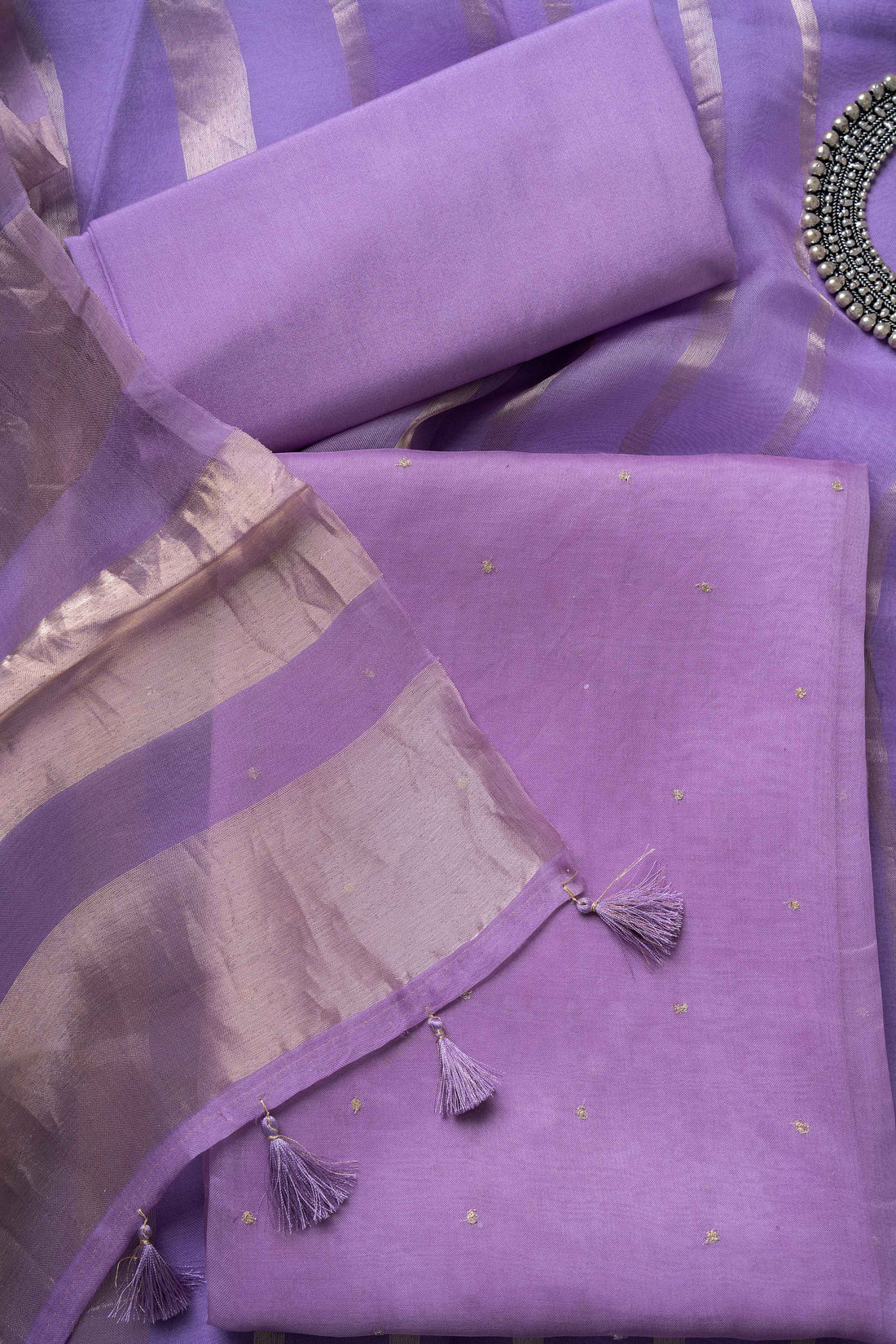 Lavender Organza Kurta with Zari Work and Tissue Stripes Dupatta Suit Material