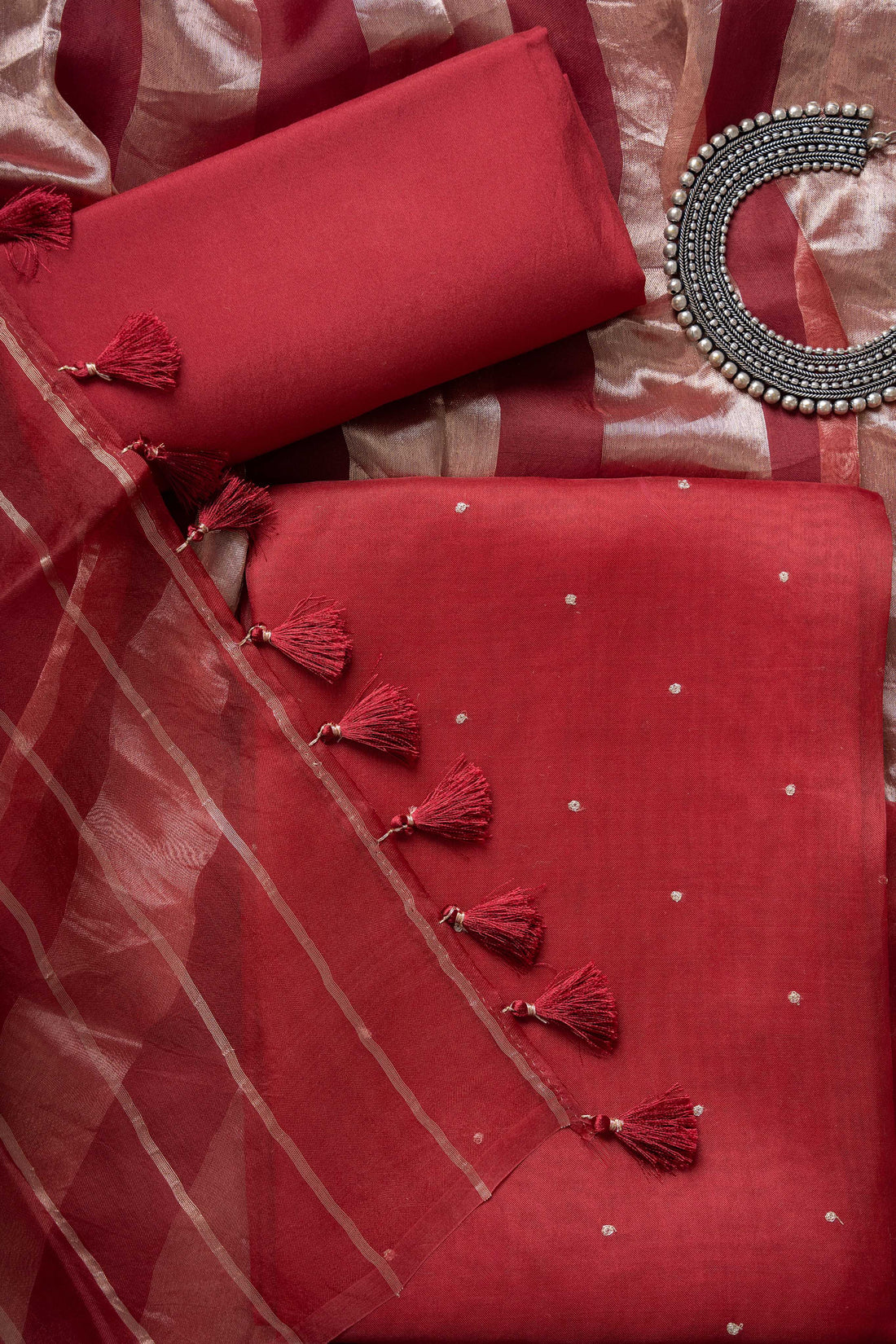 Maroon Organza Kurta with Zari Work and Tissue Stripes Dupatta Suit Material
