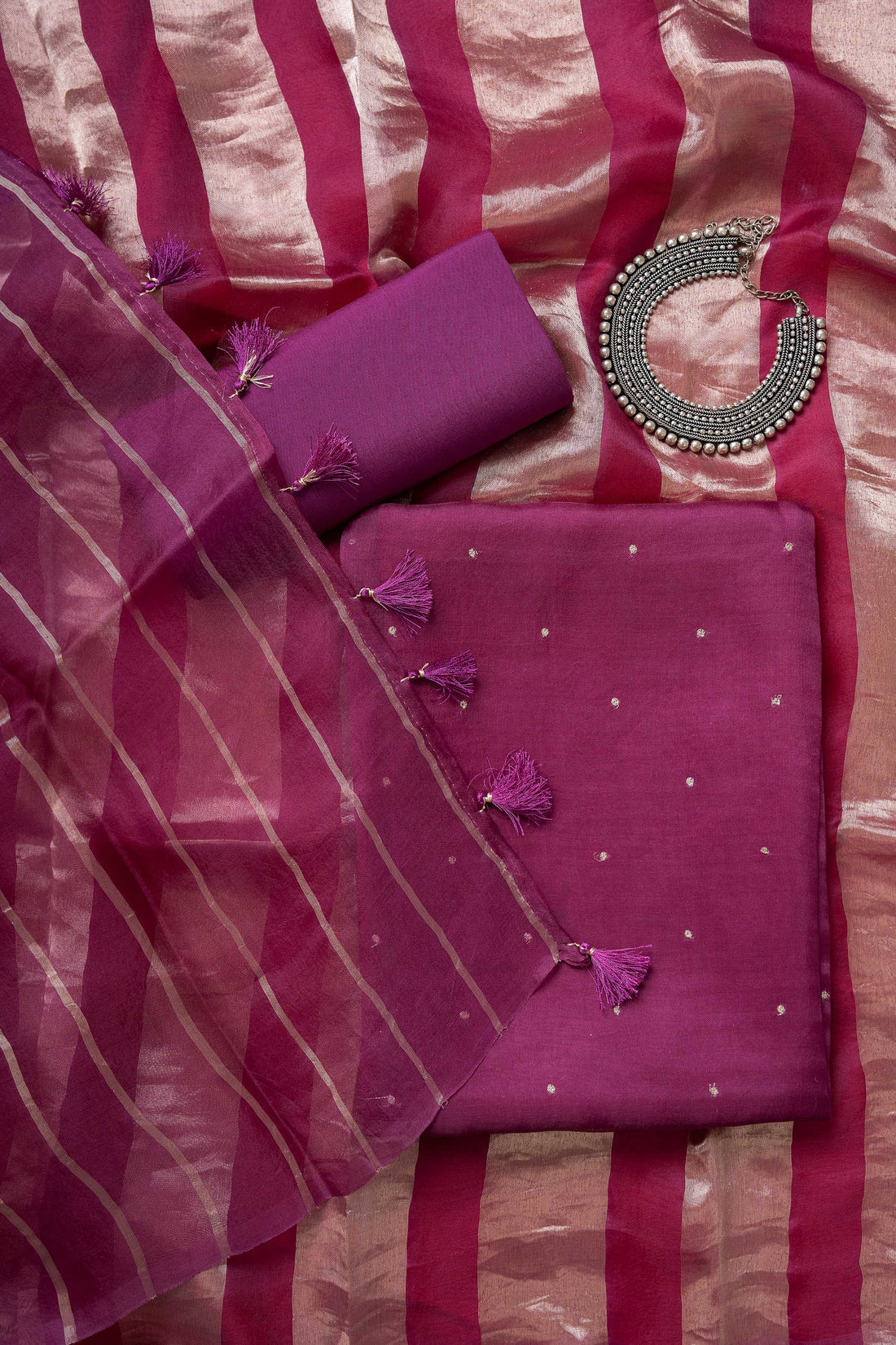Plum Purple organza Kurta with Zari Work and Tissue Stripes Dupatta Suit Material