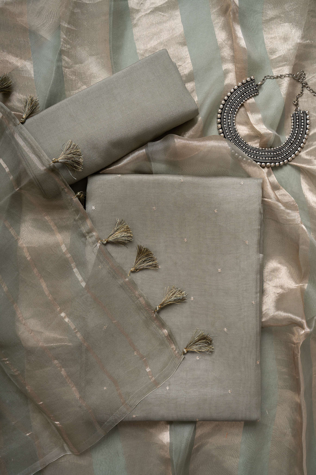 Slate Blue Organza Kurta with Zari Work and Tissue Stripes Dupatta Suit Material