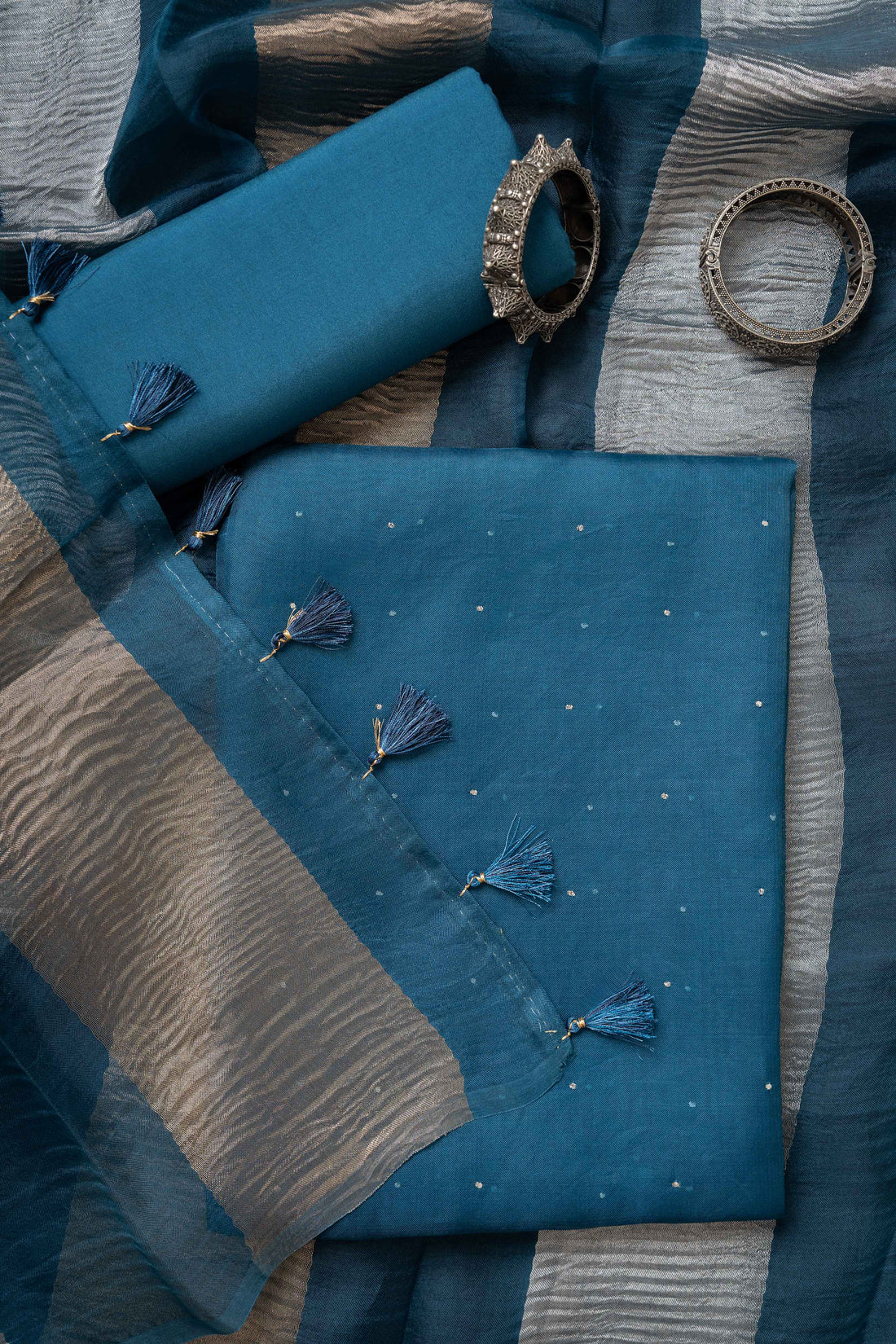Peacock Blue Organza Mukaish Worl Kurta and two tone Crush Tissue Stripes Dupatta Suit Material