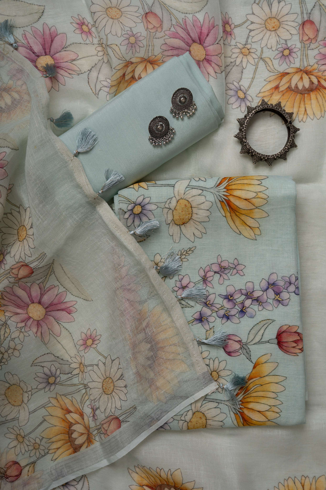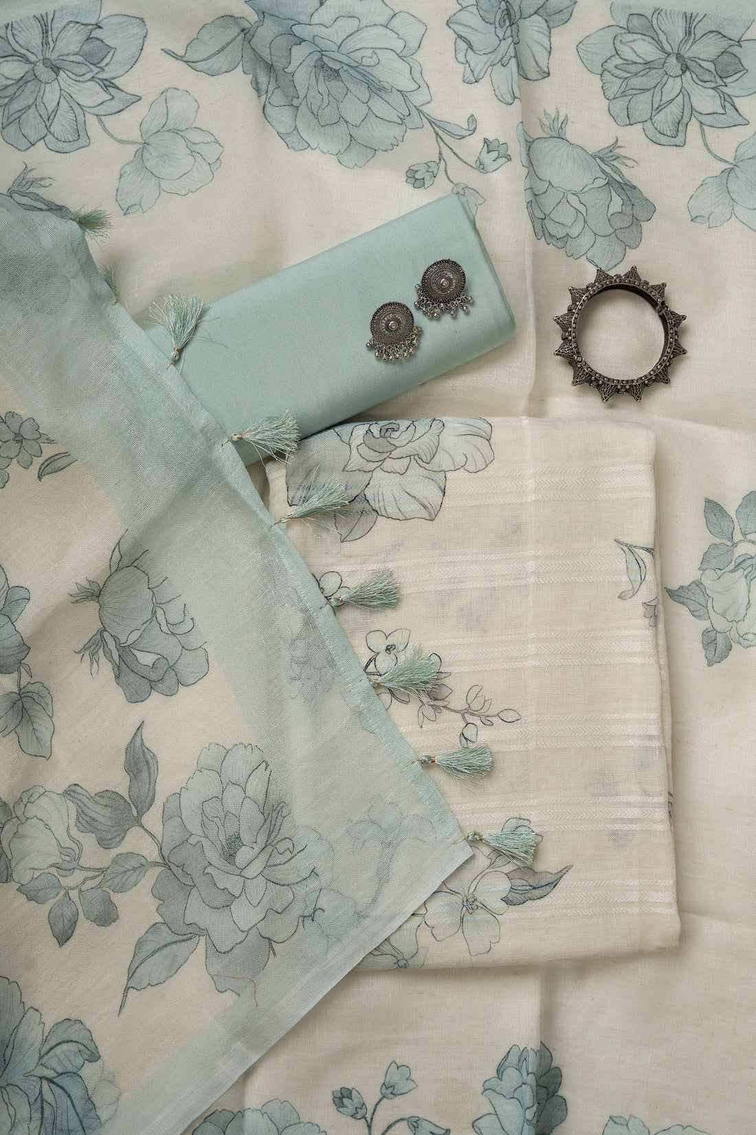 White and Sky Blue self weaving Linen Digital Print Froral Suit Material