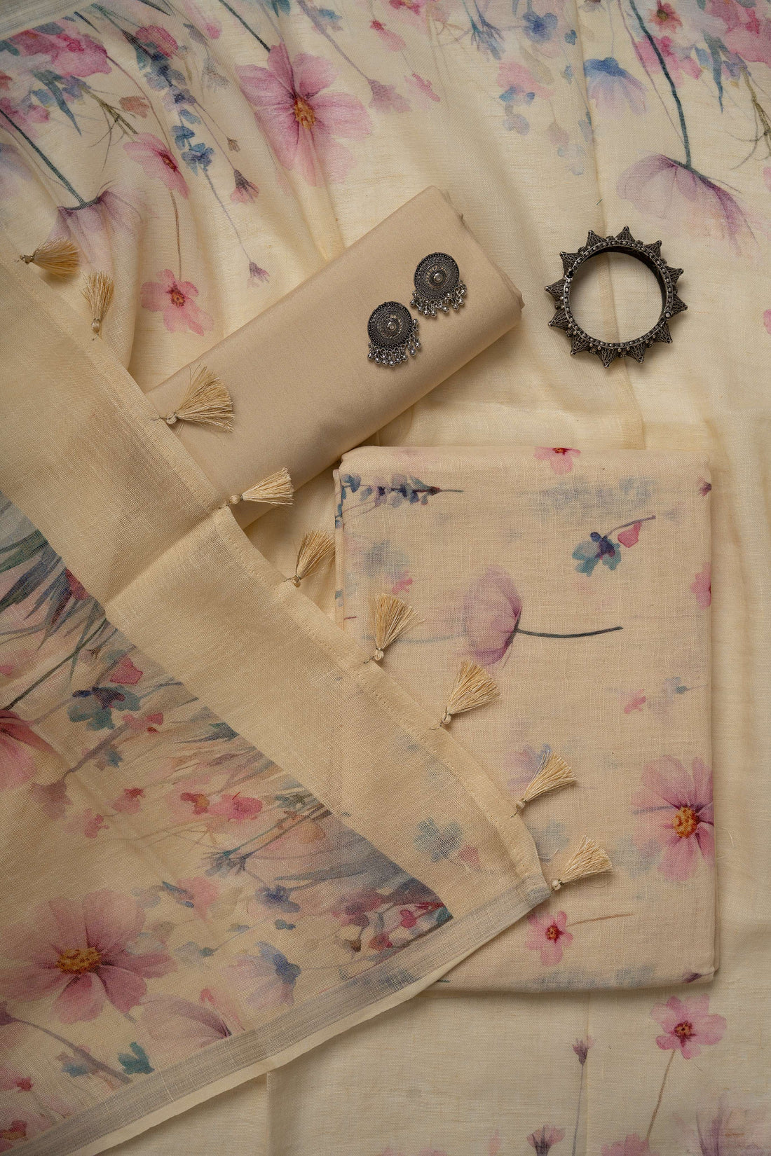 White and Peach Self Weaving Linen Digital Floral Print Suit Material