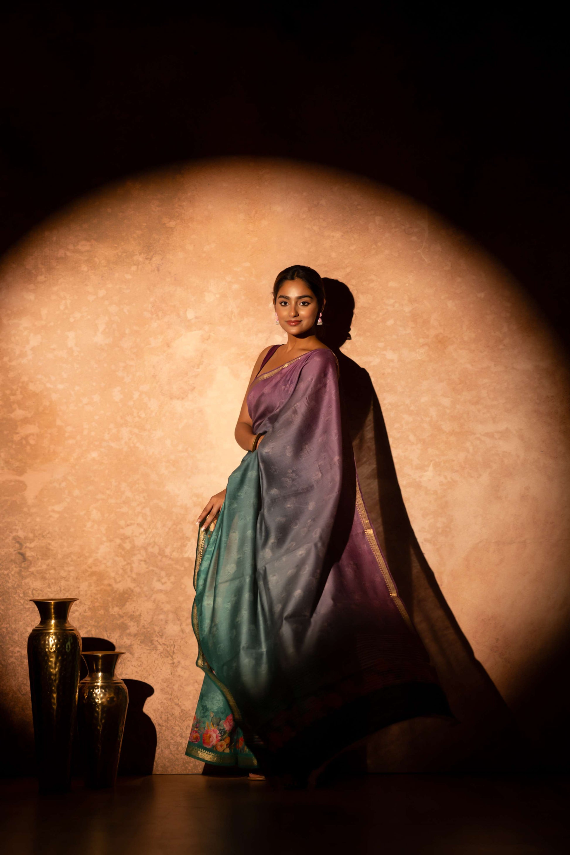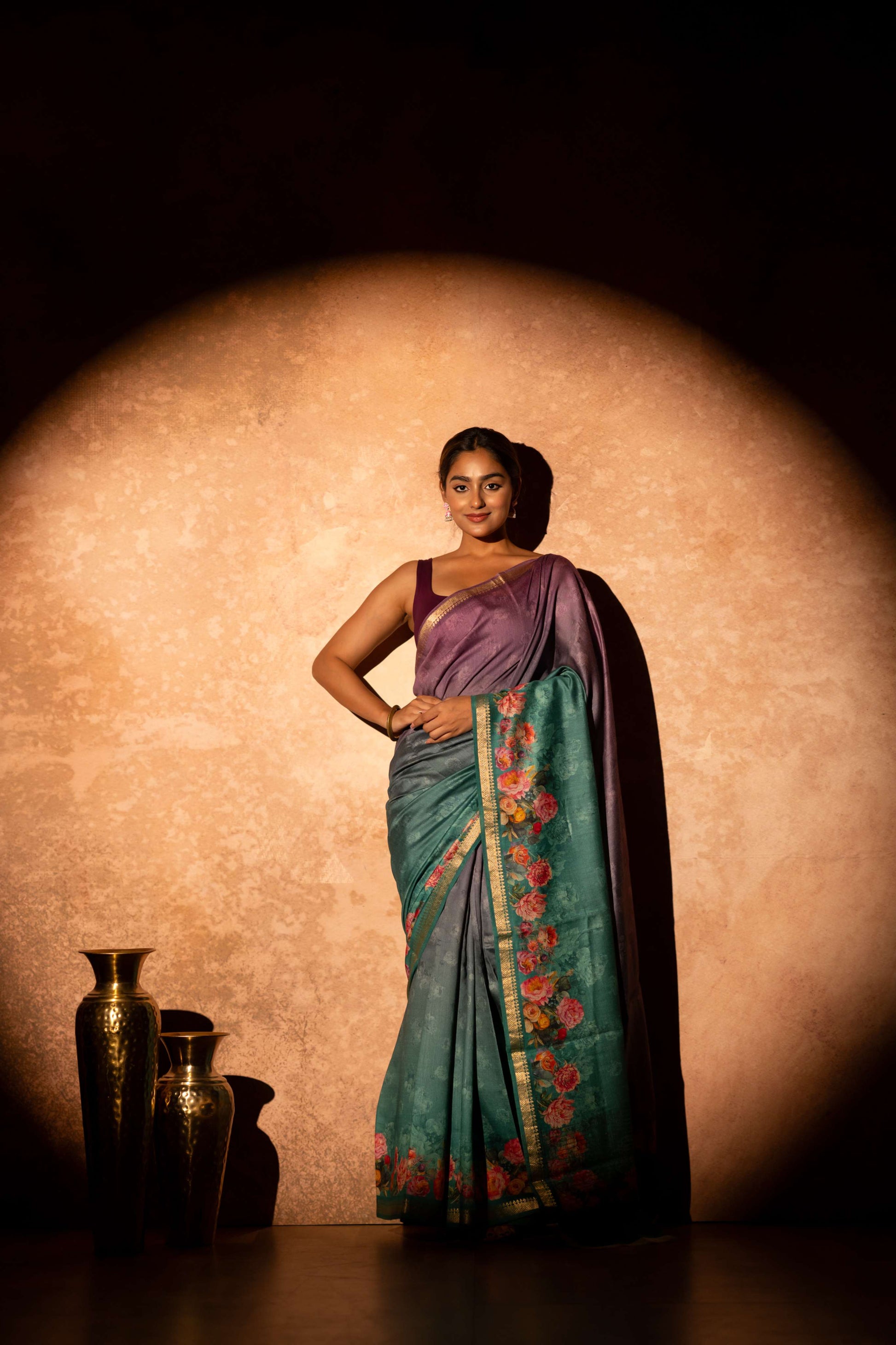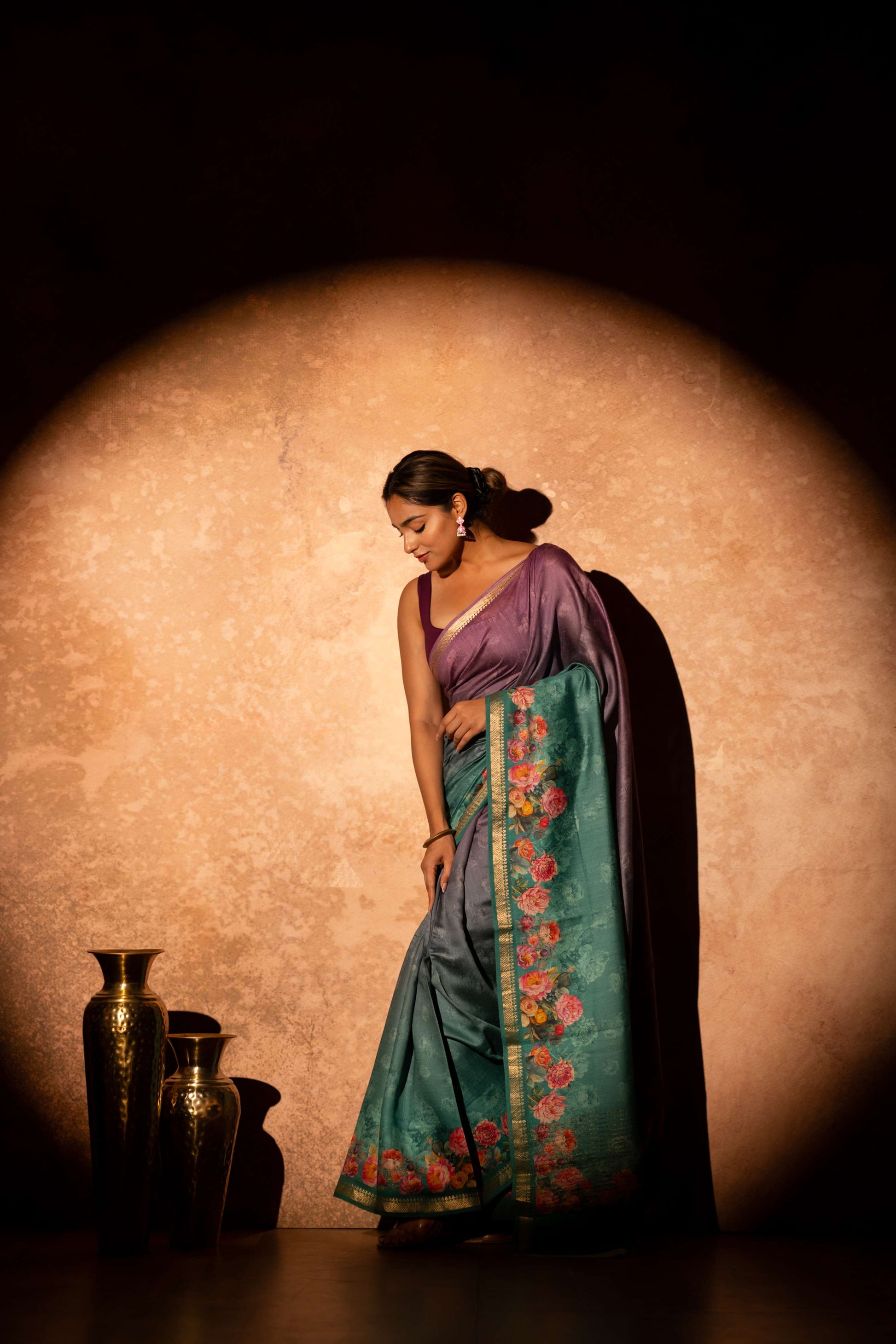 This saree comes with its own blouse piece. The blouse shown on the model is used solely for styling and presentation.