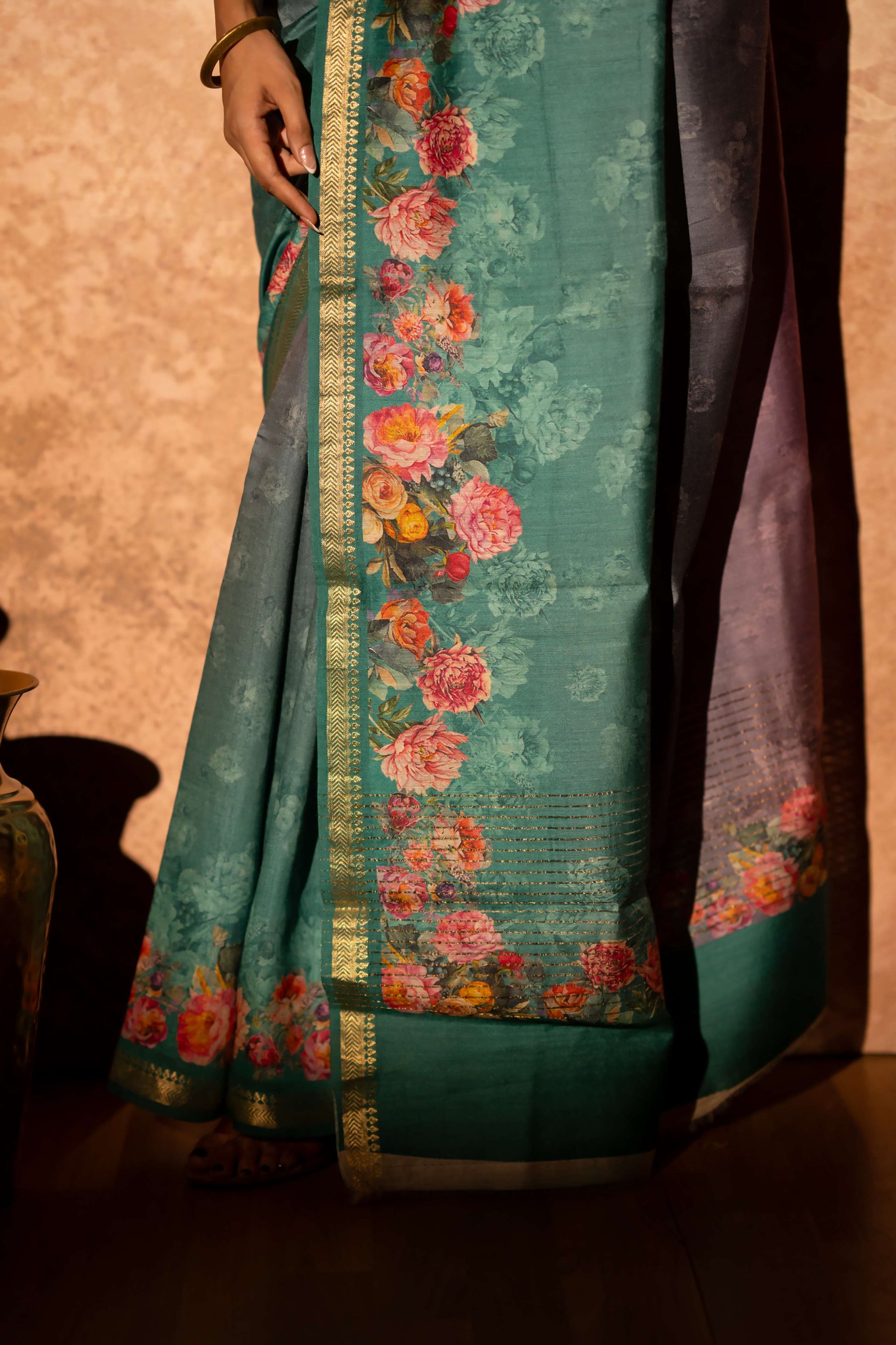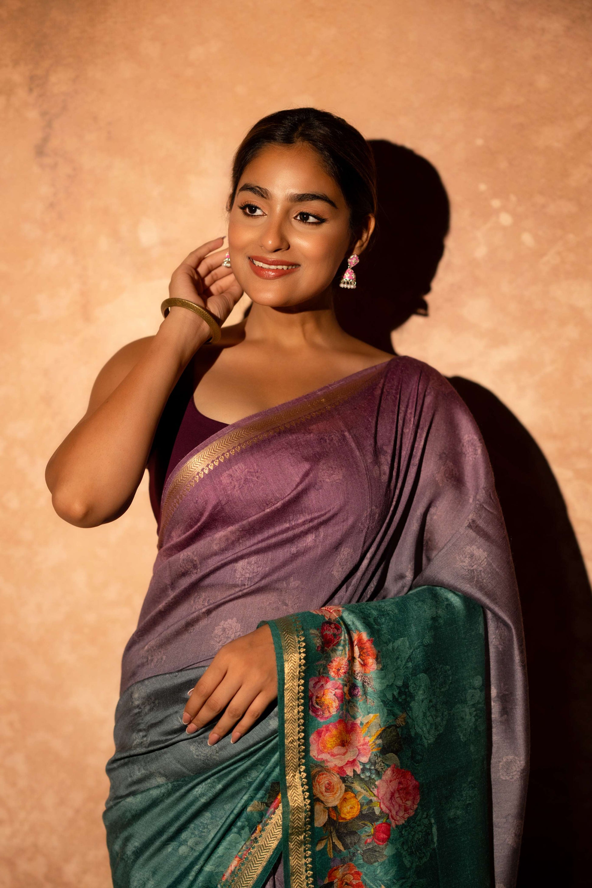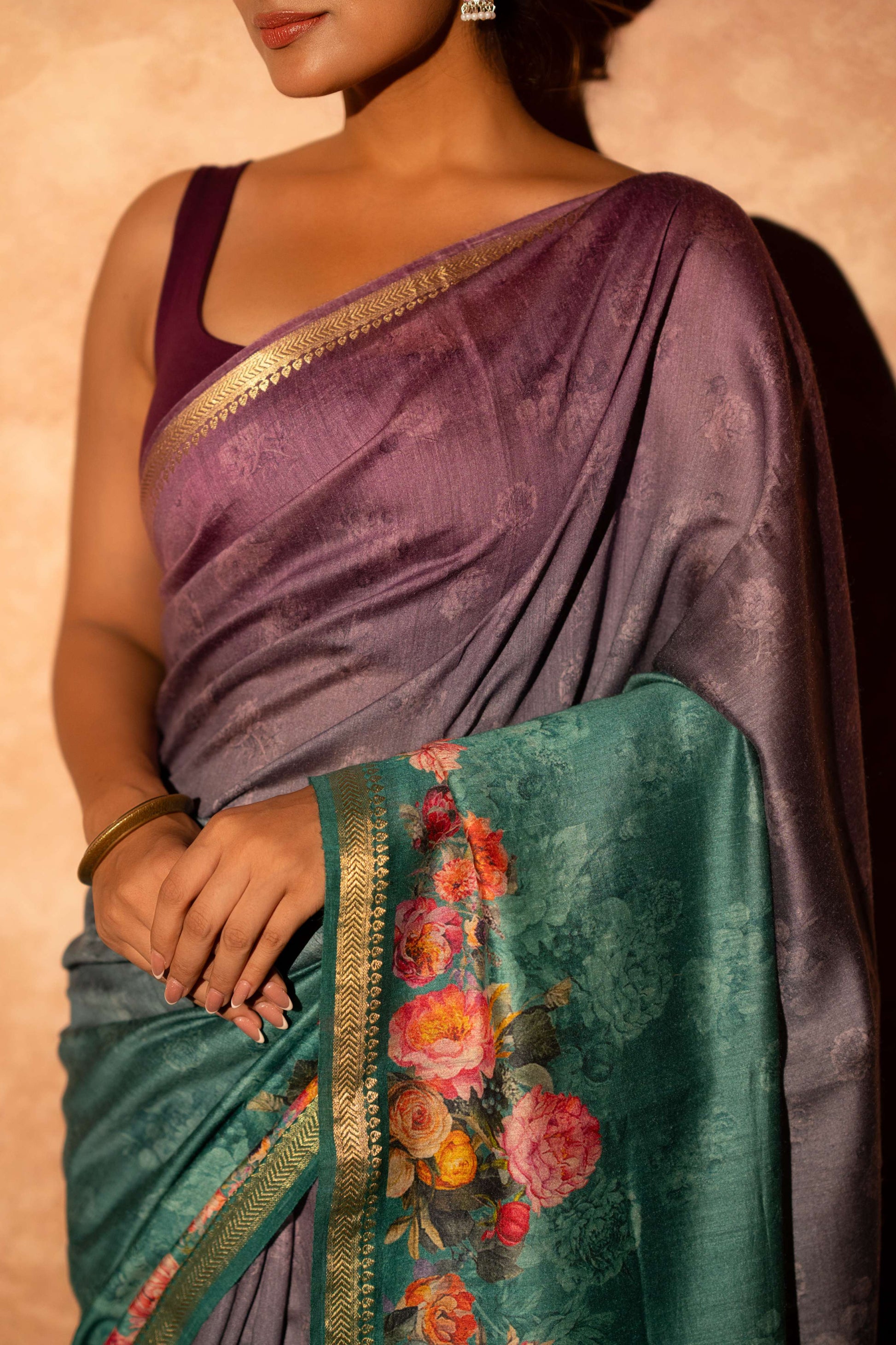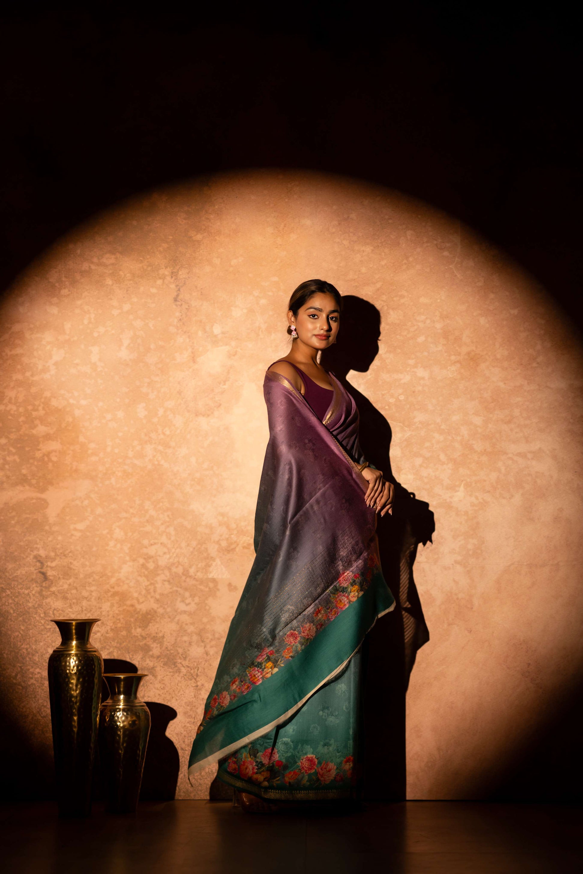 This saree comes with its own blouse piece. The blouse shown on the model is used solely for styling and presentation.