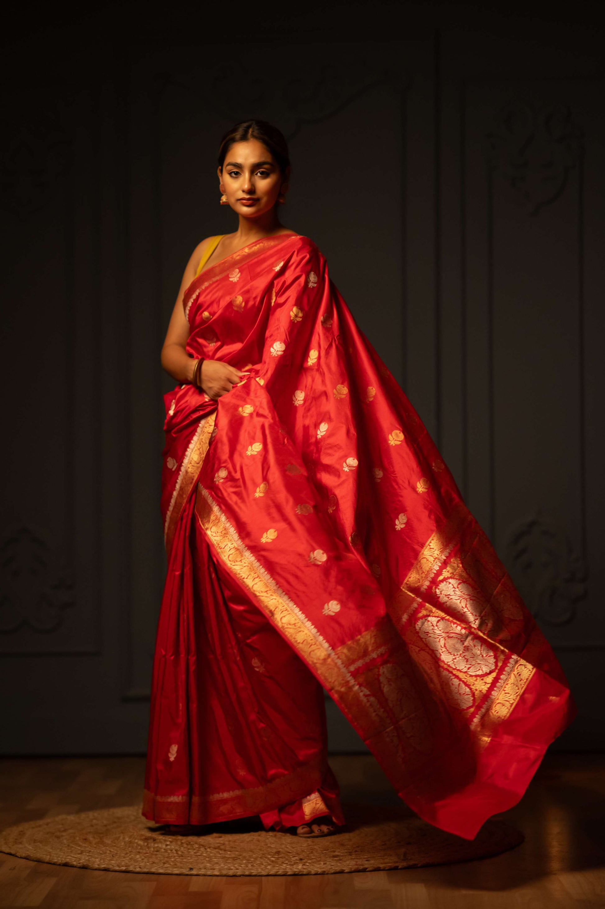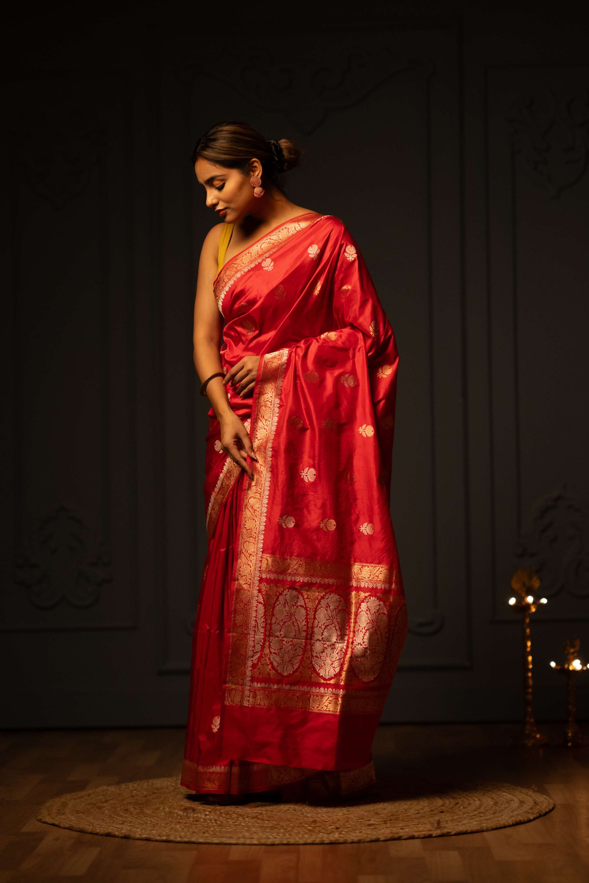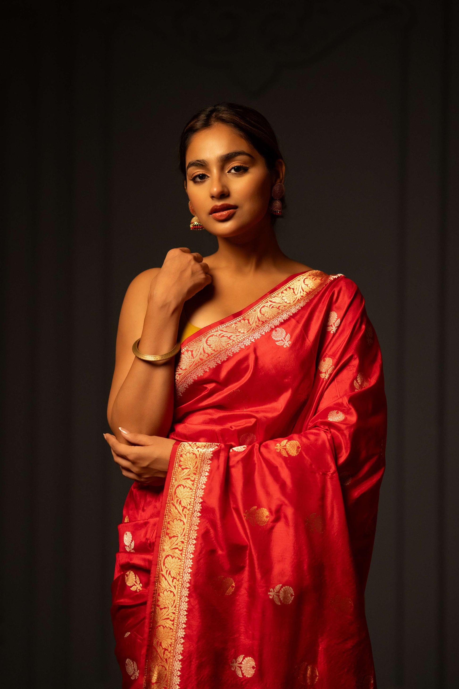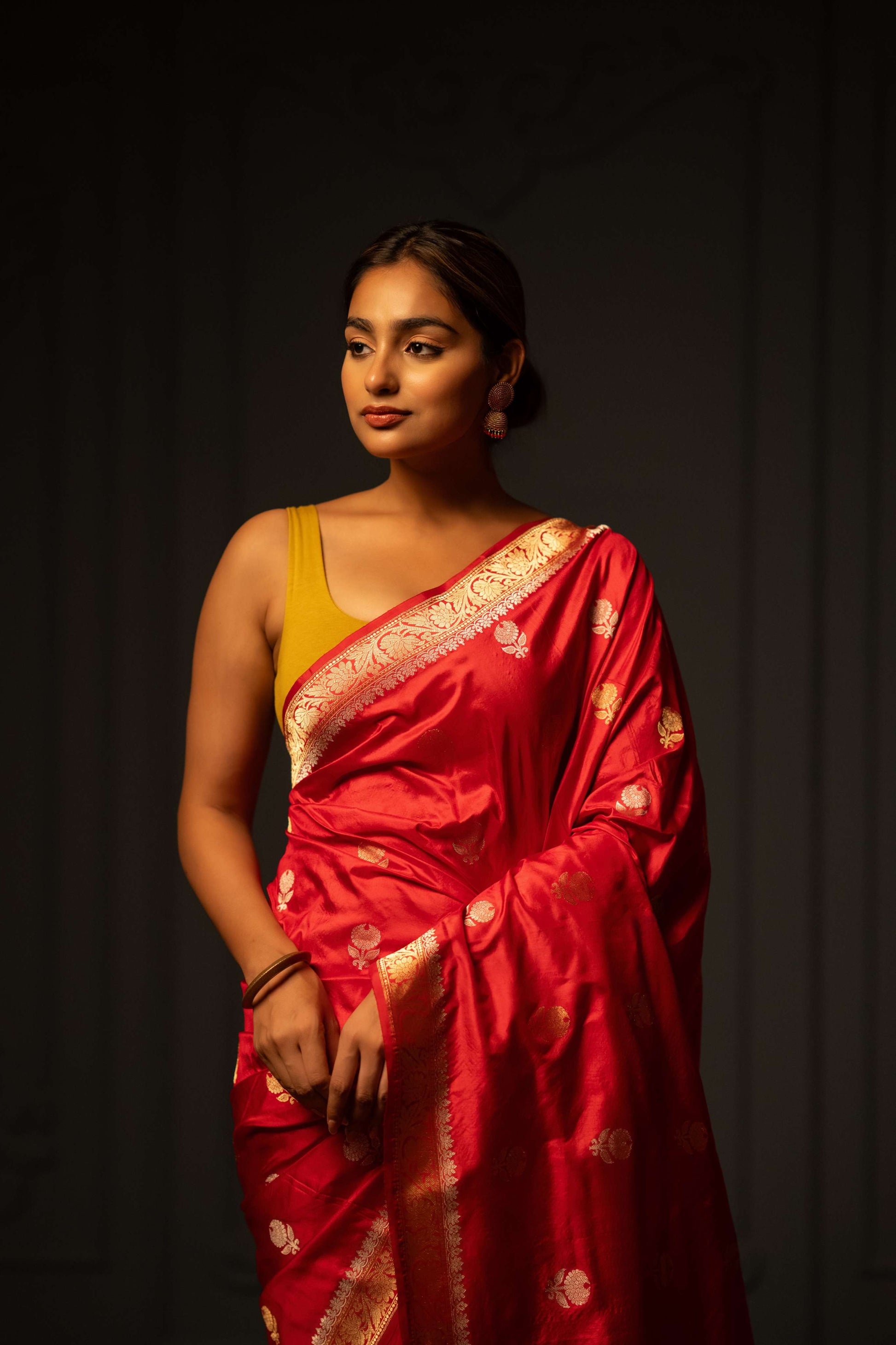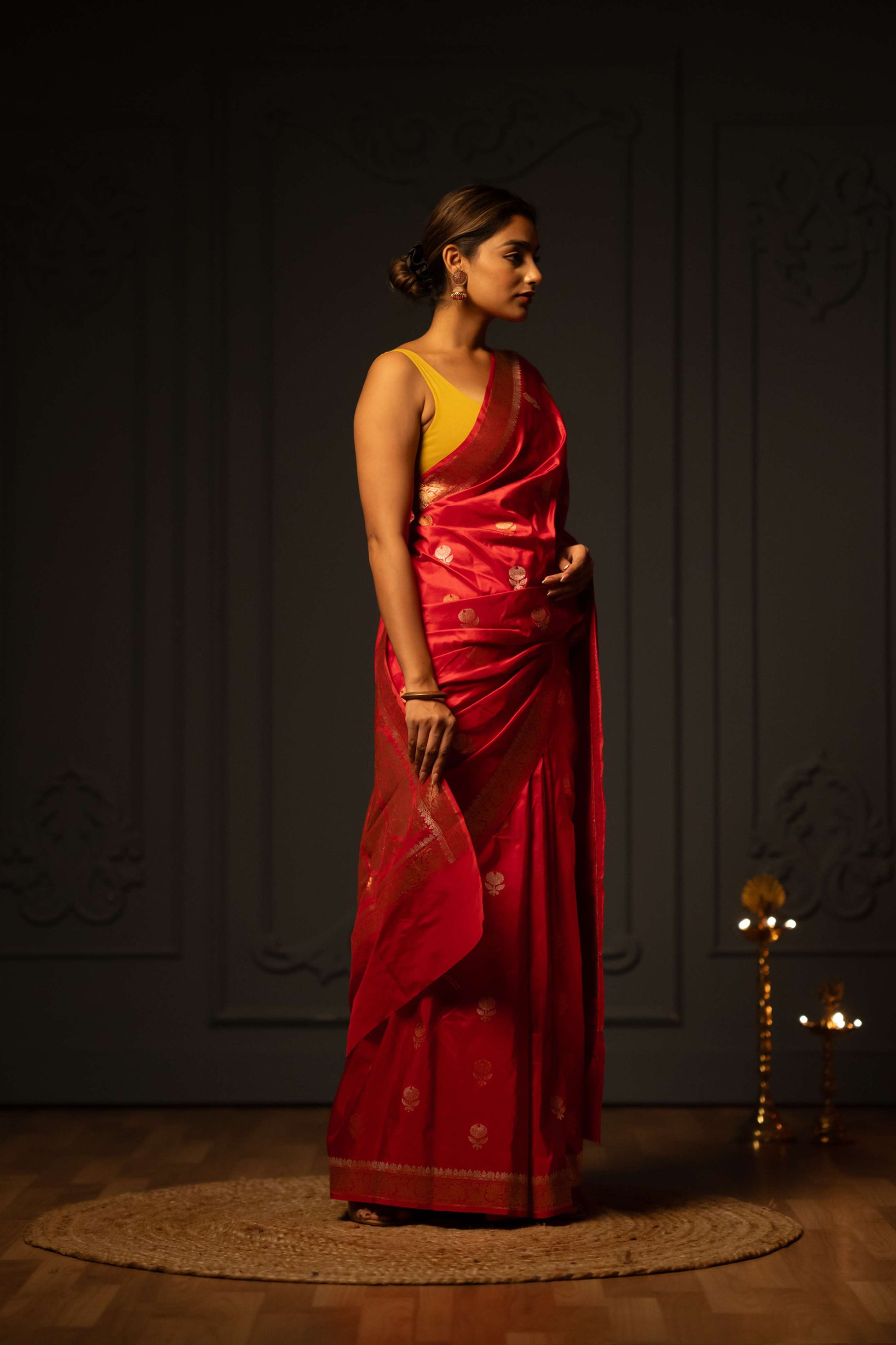 This saree comes with its own blouse piece. The blouse shown on the model is used solely for styling and presentation.