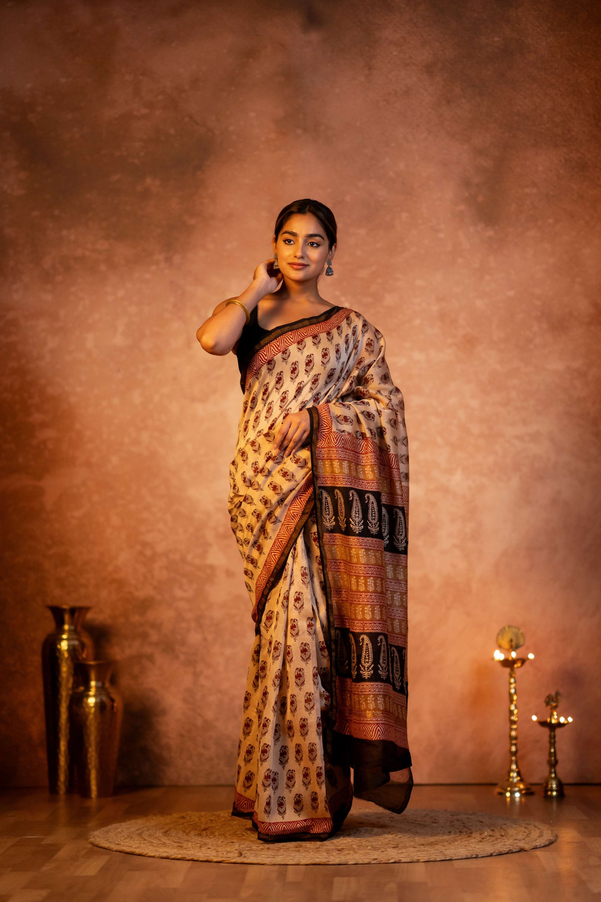 Fawn Hand Block Print Chanderi Saree