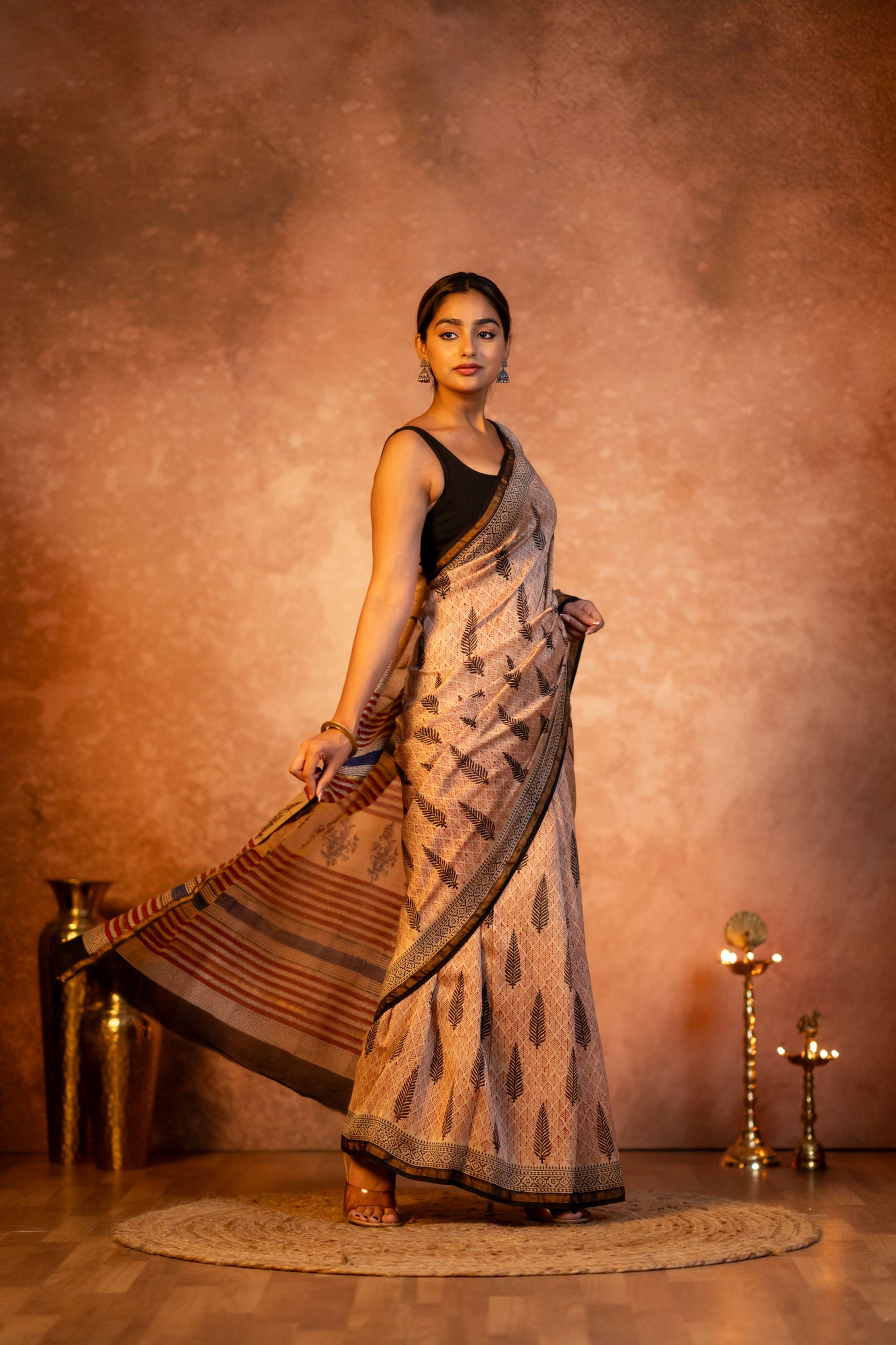 Fawn Long Booti Hand Block Print Chanderi Saree