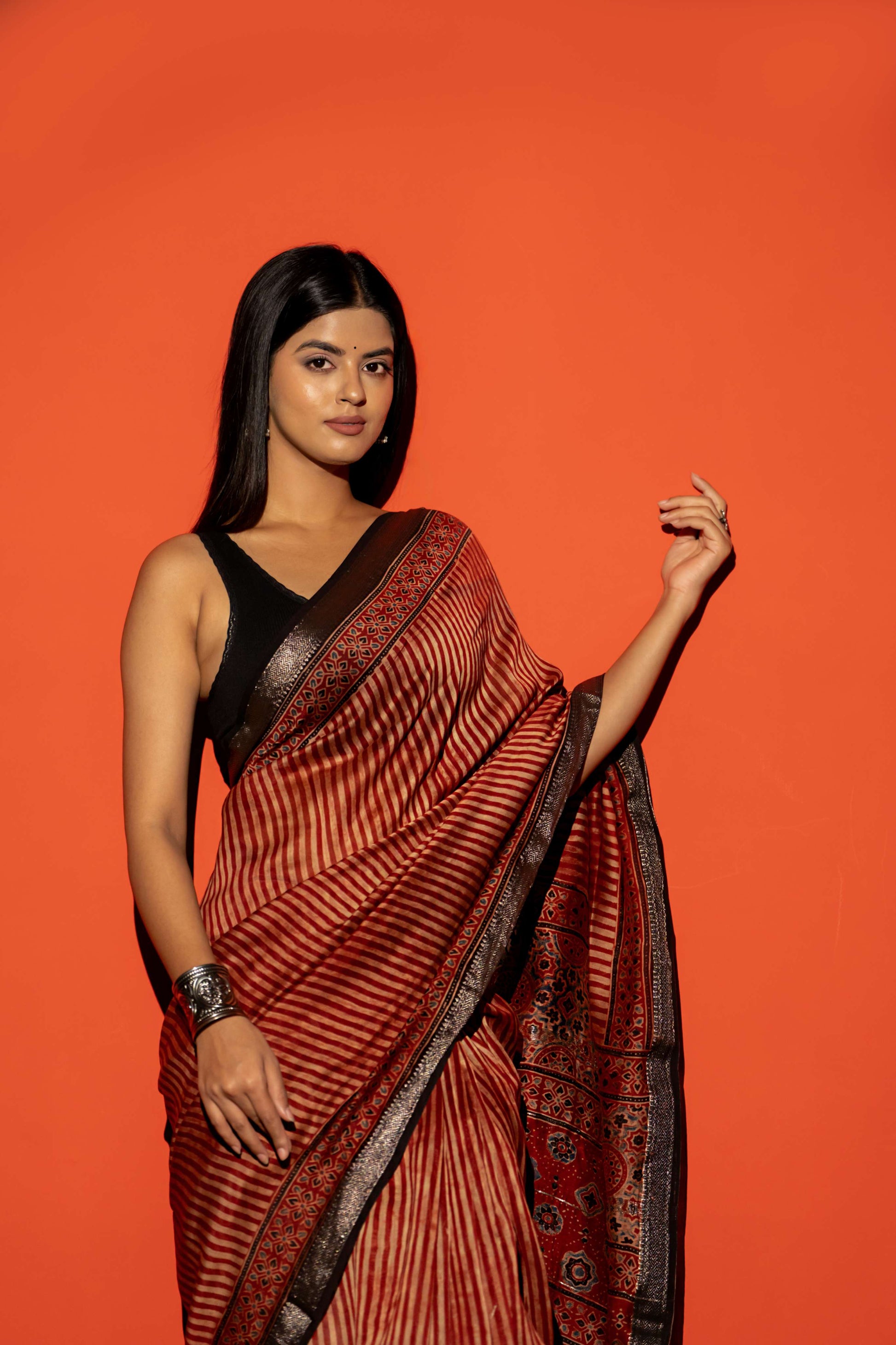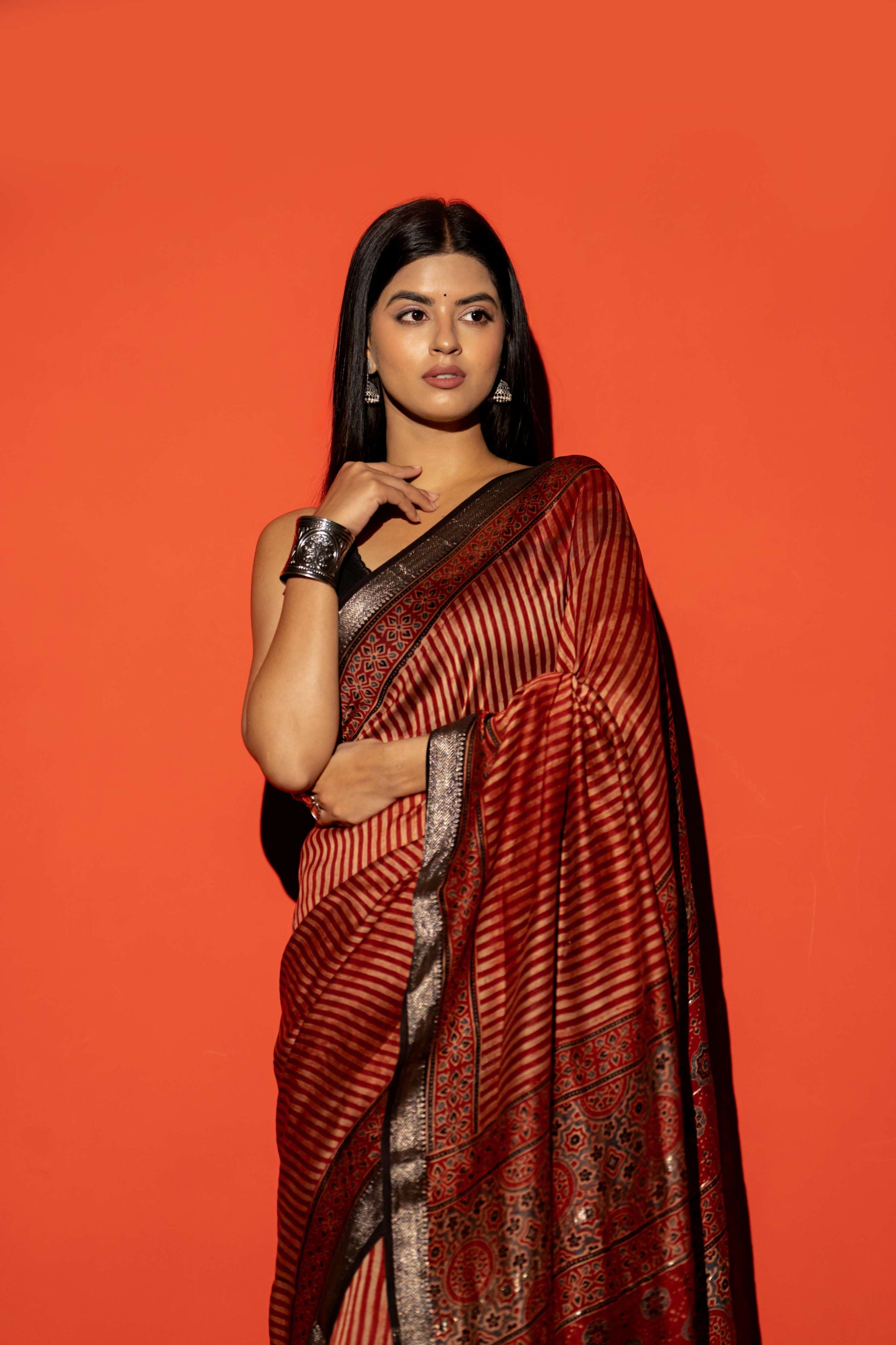 Rust Stripe Ajrakh Print Maheshwari Silk Cotton Saree