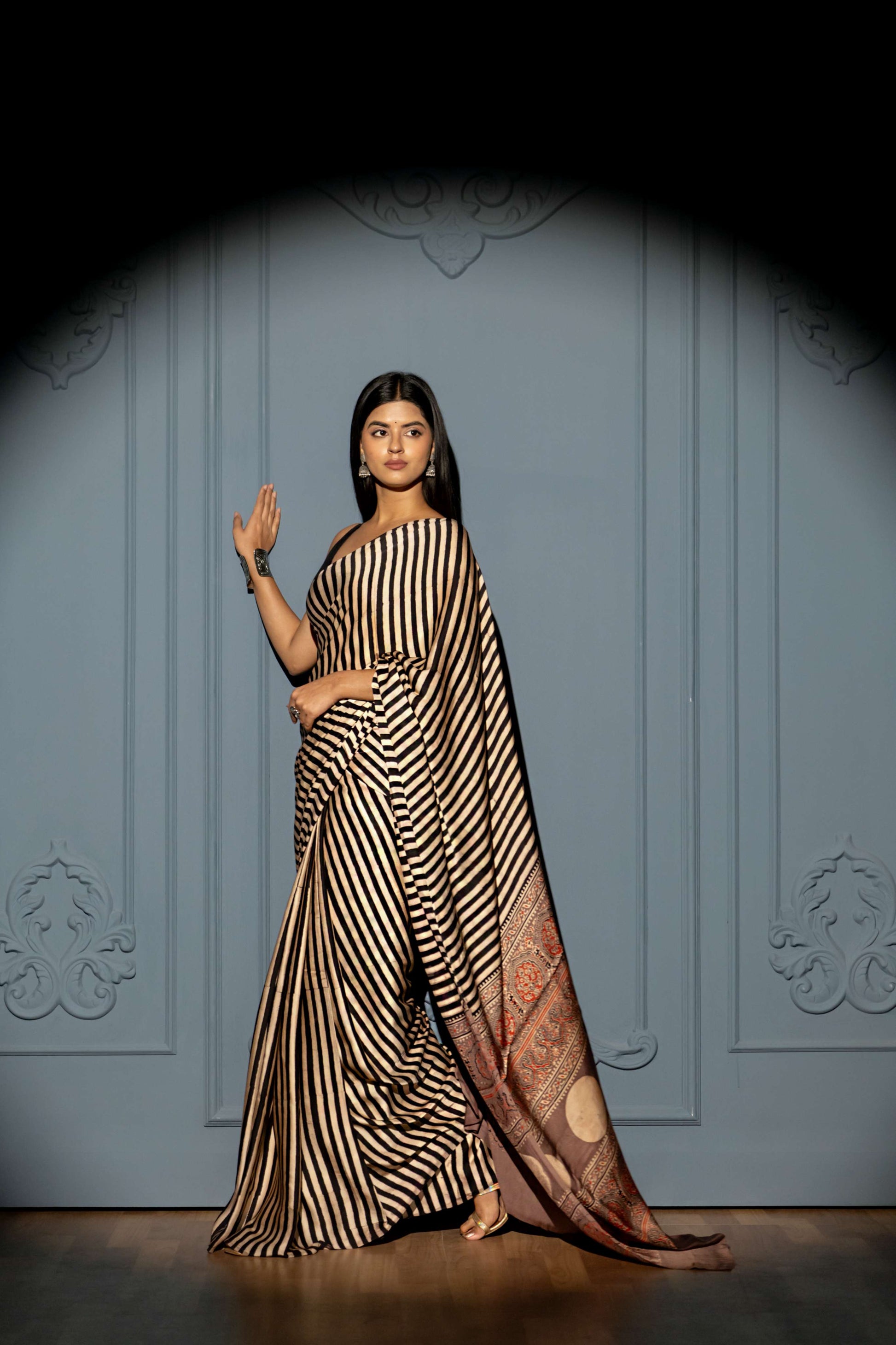 This modal silk saree embodies understated luxury with its cream and black striped body, enhanced by an ornate biscuit brown Ajrakh print pallu. Modal silk's inherent softness and fluid drape create an effortlessly graceful silhouette, while the hand-printed Ajrakh patterns reflect centuries of textile heritage. The neutral palette with warm undertones offers remarkable versatility, allowing you to style it across multiple occasions—from intimate gatherings to grand celebrations. Each wear reveals the fabric's natural sheen and the pallu's intricate detailing, making this piece a timeless investment.