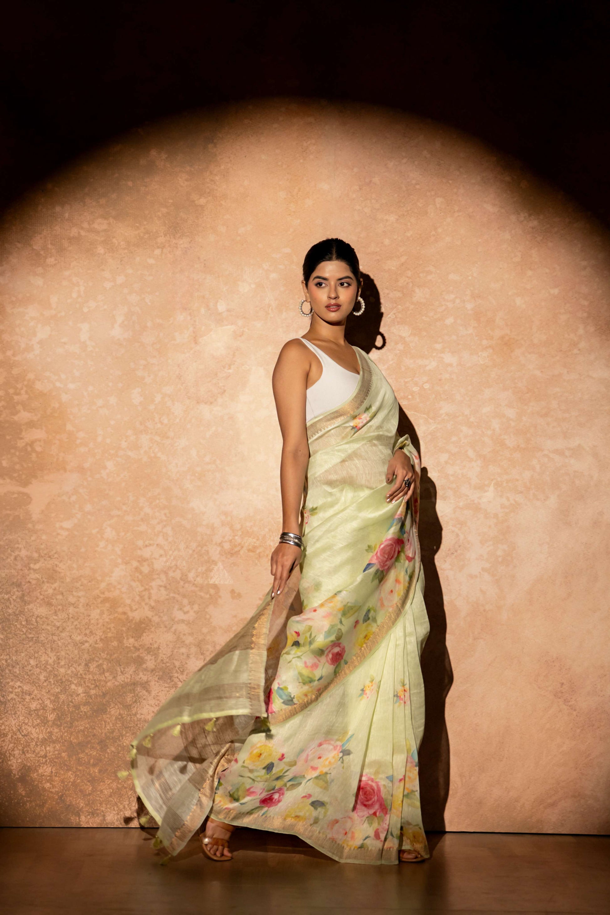 Light Pista Green Floral Digital Print Pure Linen Silk Saree witht Tussar Border and Pallu
