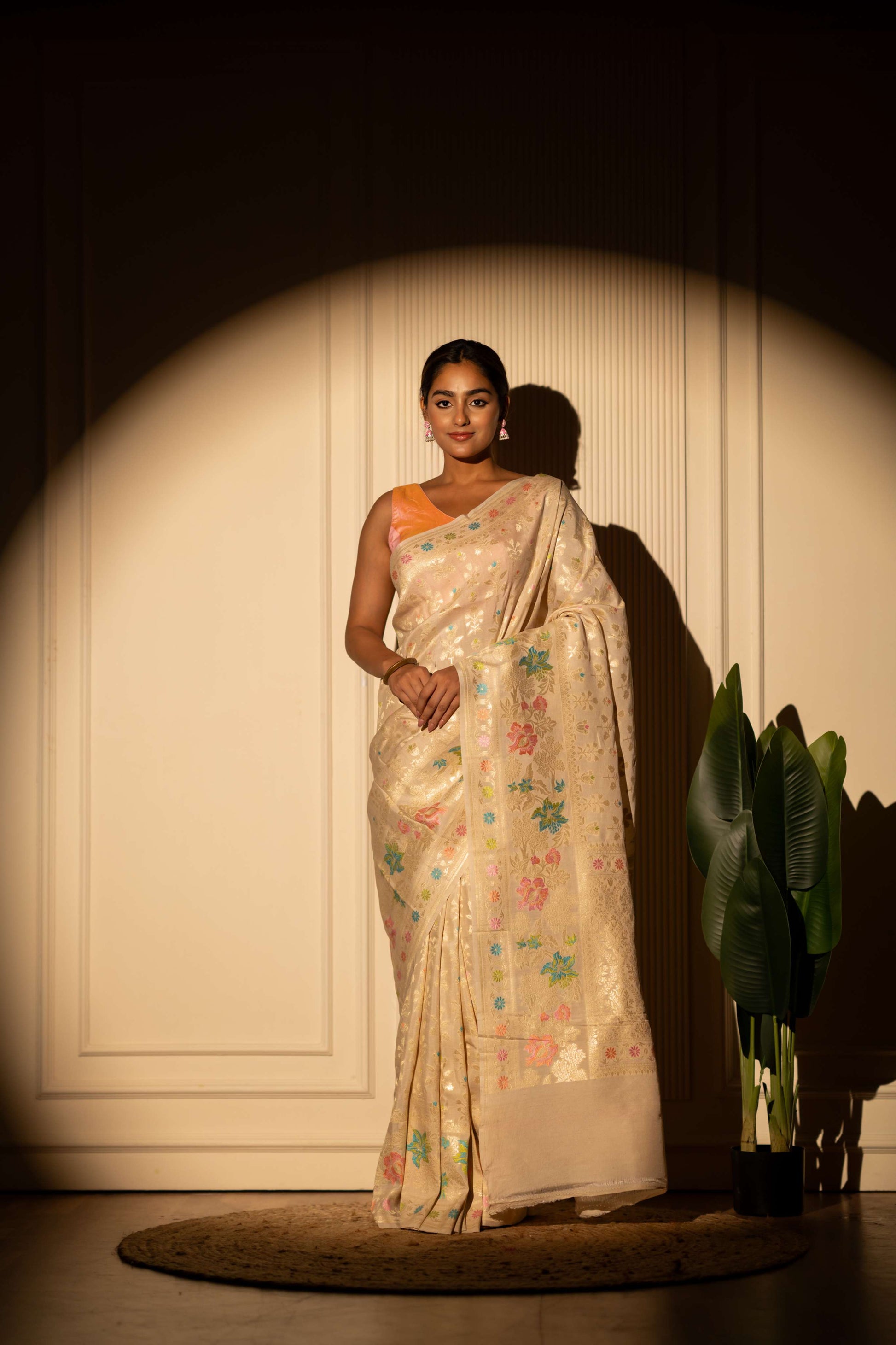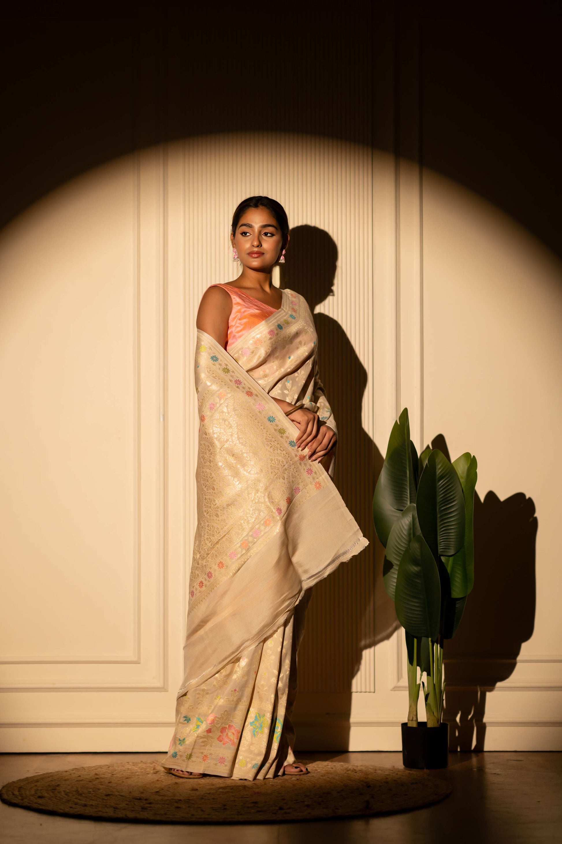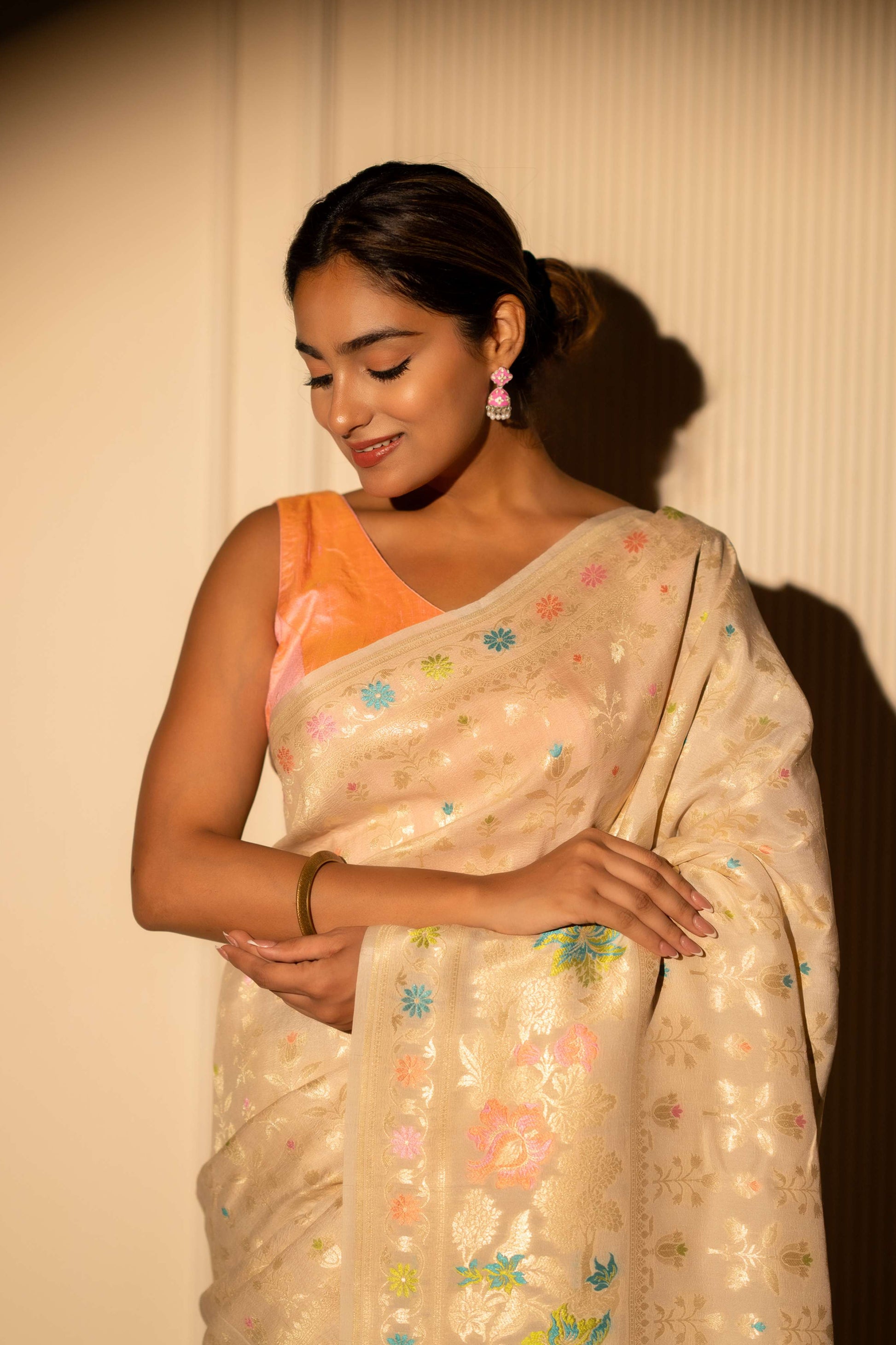 This saree comes with its own blouse piece. The blouse shown on the model is used solely for styling and presentation.