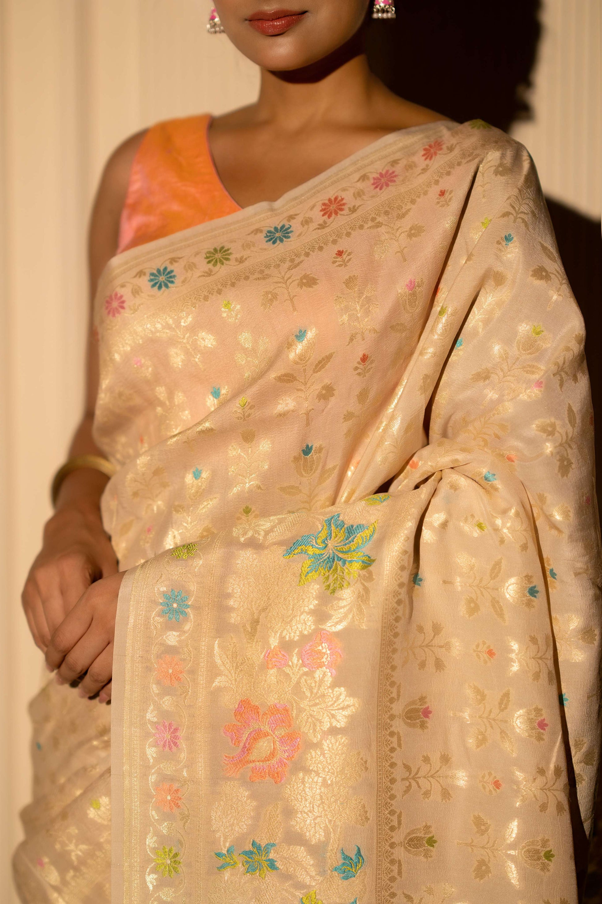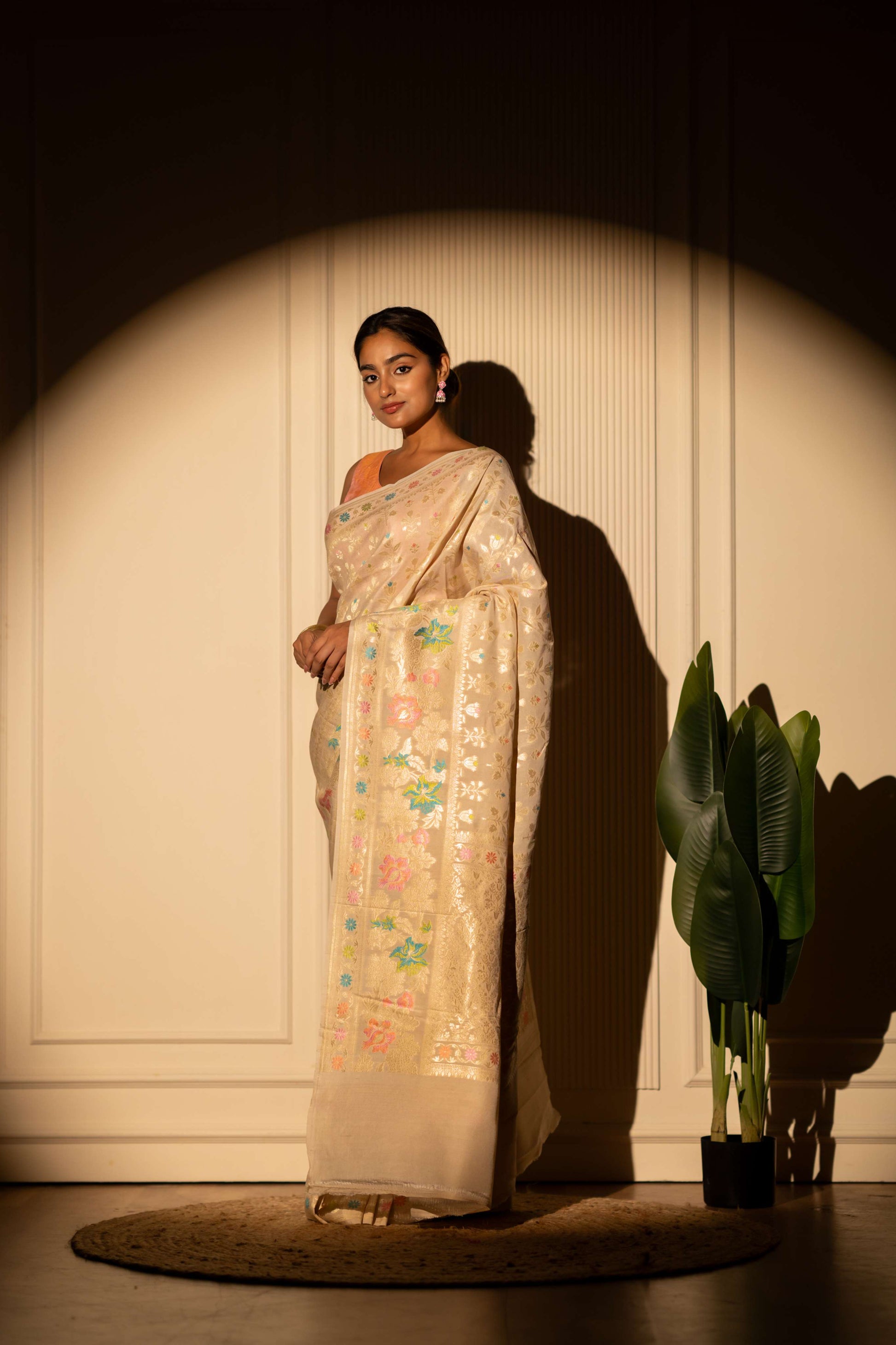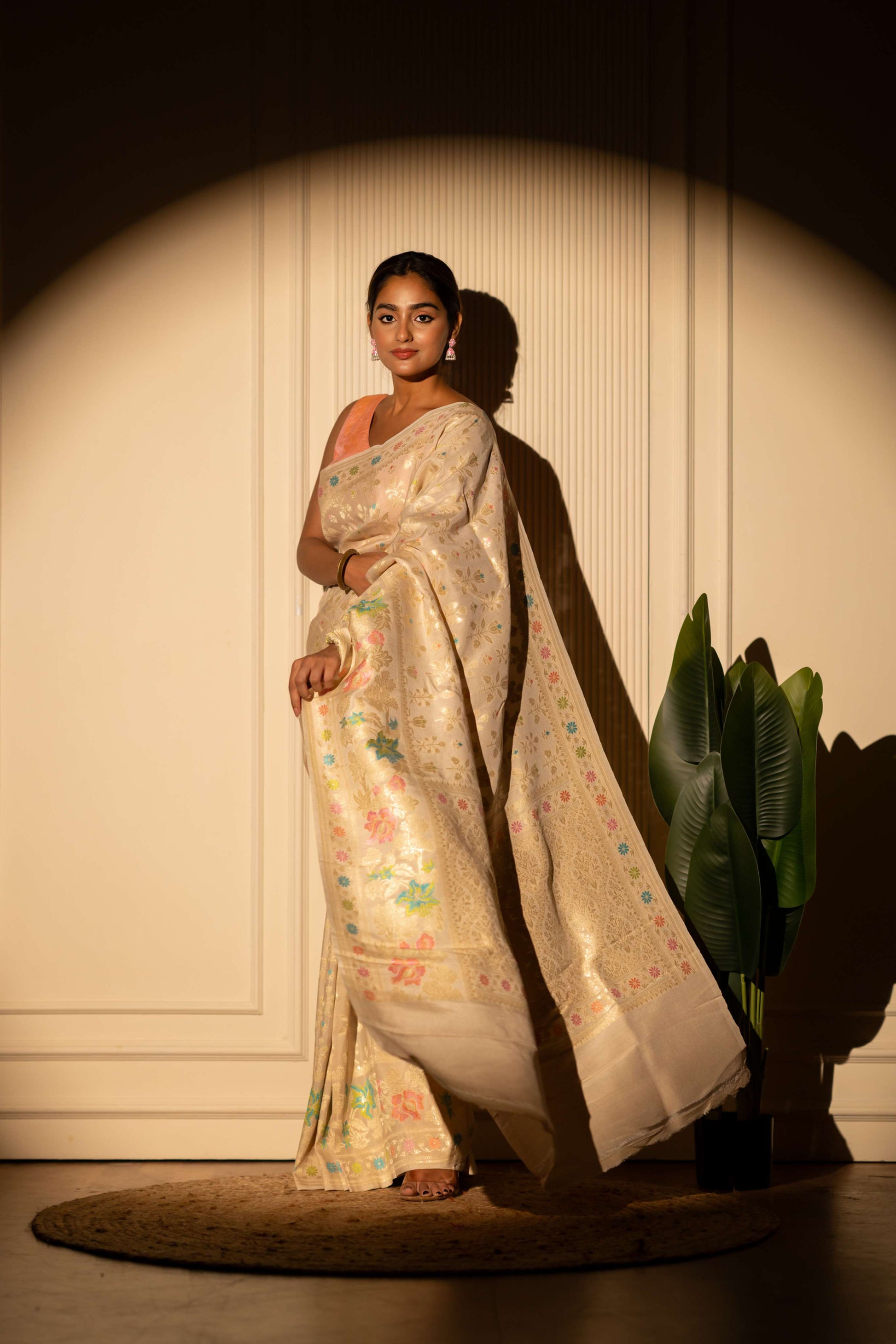 This saree comes with its own blouse piece. The blouse shown on the model is used solely for styling and presentation.