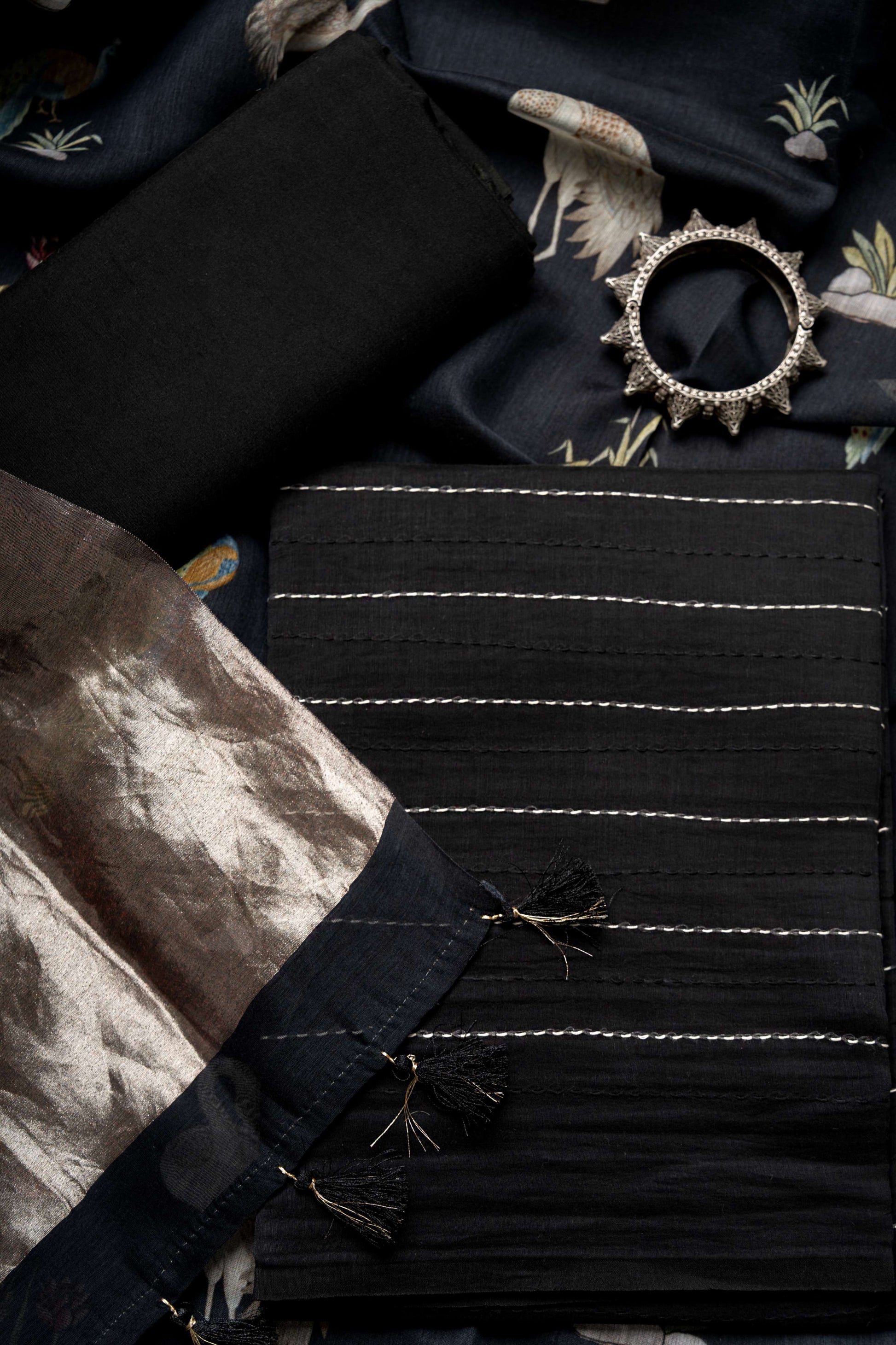 Elevate your ethnic wardrobe with this sophisticated ensemble featuring a black flamingo-printed tissue pallu Chanderi dupatta paired with a traditional Kantha kurta. The dupatta showcases delicate digital print work on premium Chanderi fabric, known for its lightweight drape and subtle sheen. The kurta combines timeless Kantha embroidery craftsmanship with contemporary design sensibilities, while the coordinated bottom completes the look.