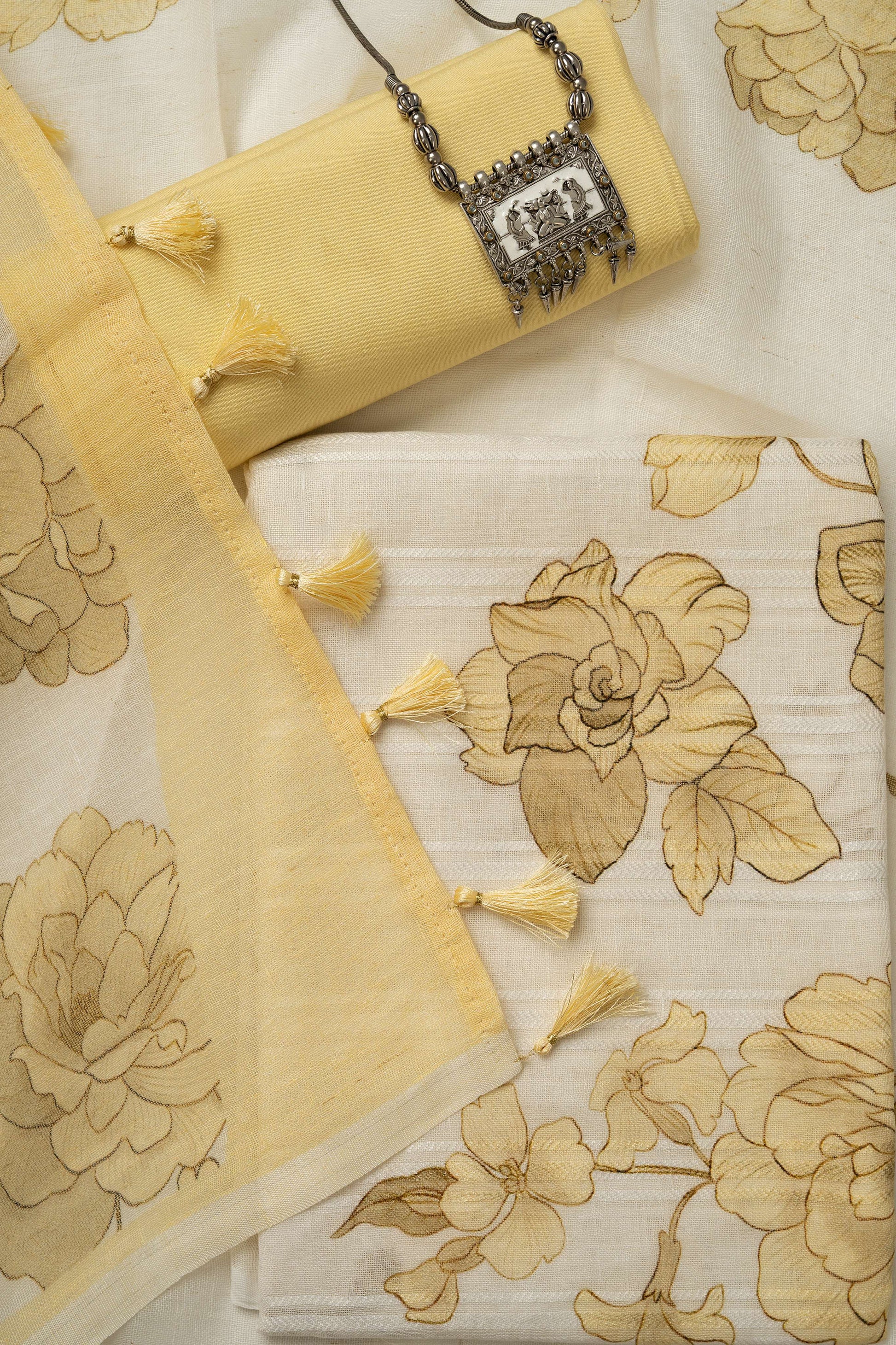 White and yellow self weaving Linen Digital Print Froral Suit Material