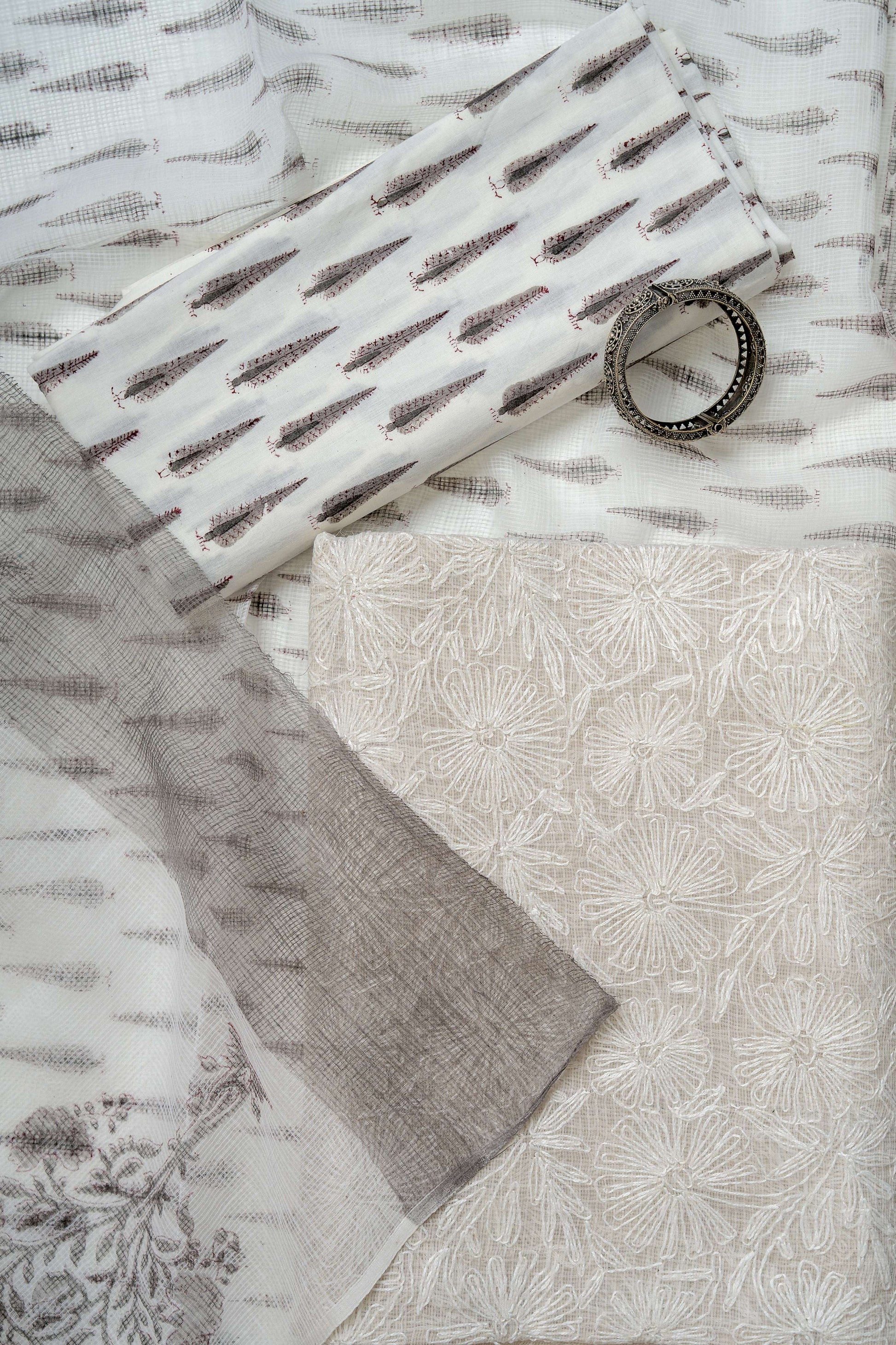 White and GreyTepchi work on kota doria kurta with block print bottom and dupatta